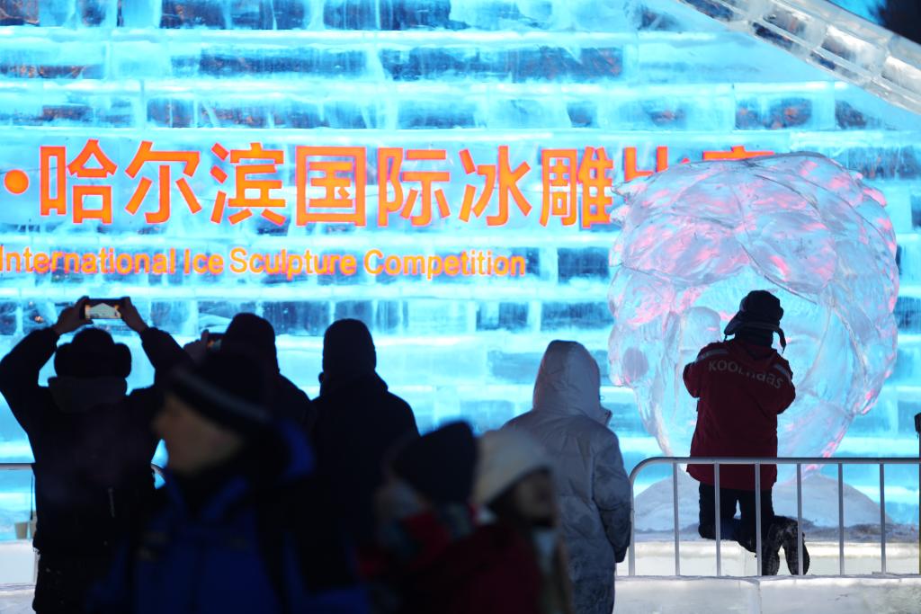 在哈尔滨冰雪大世界园区内举行的第35届中国·哈尔滨国际冰雕比赛现场,选手进行冰雕创作时吸引许多游客驻足观赏(1月2日摄)。