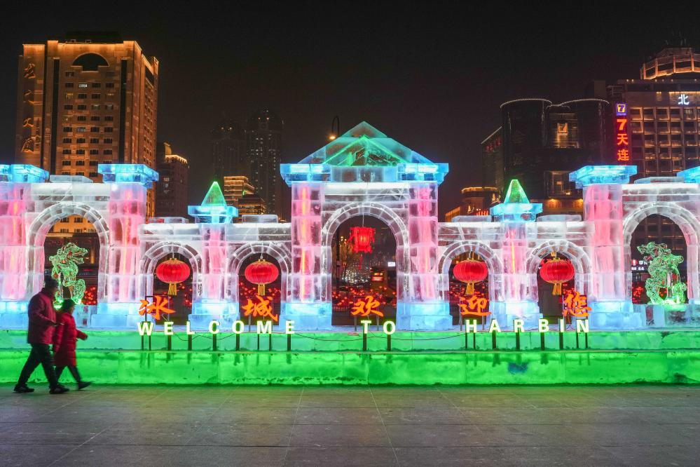 旅客经过哈尔滨站站前广场上的冰雪景观(1月3日摄)。