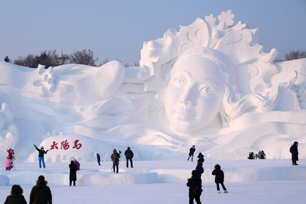 阳光明媚、碧空如洗,太阳岛上一片洁白,第36届哈尔滨太阳岛雪博会张开怀抱。百米长的主塑《雪绒花》由80余名雪雕匠人历时10余天雕刻完成,美丽的少女头戴皇冠,飘逸的长发寓意生机,传递着幸福快乐、生活美好的祝愿。