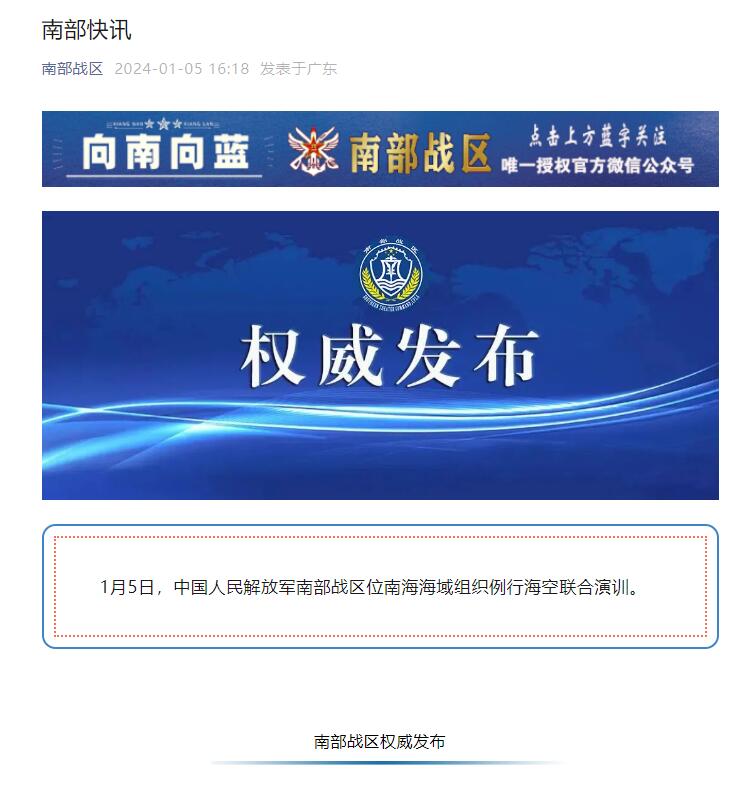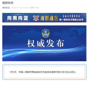 1月5日,中国人民解放军南部战区位南海海域组织例行海空联合演训。