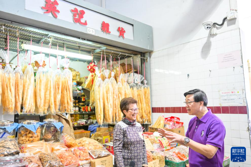 1月6日,香港特区行政长官李家超在沙头角与当地商户交谈。