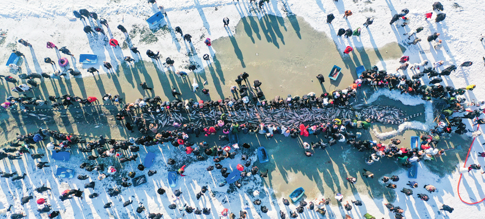 游客在查干湖冰面上观看冬捕(2023年12月28日摄) 张楠摄/本刊