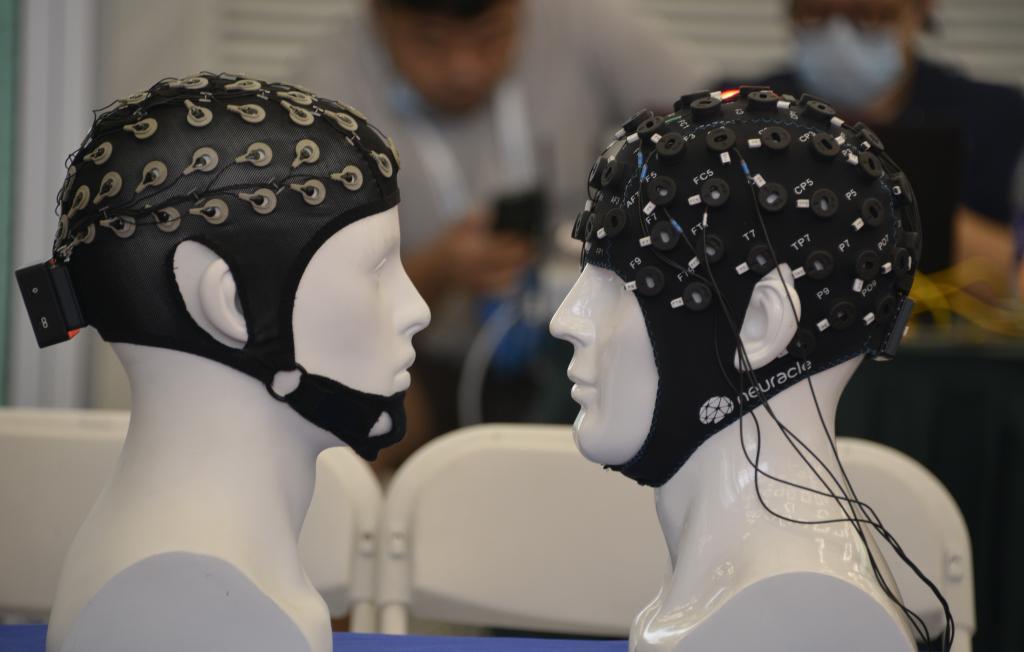 图为2021世界机器人大会上展示的脑机接口技术(2021年9月12日摄)。(新华社记者李欣摄)