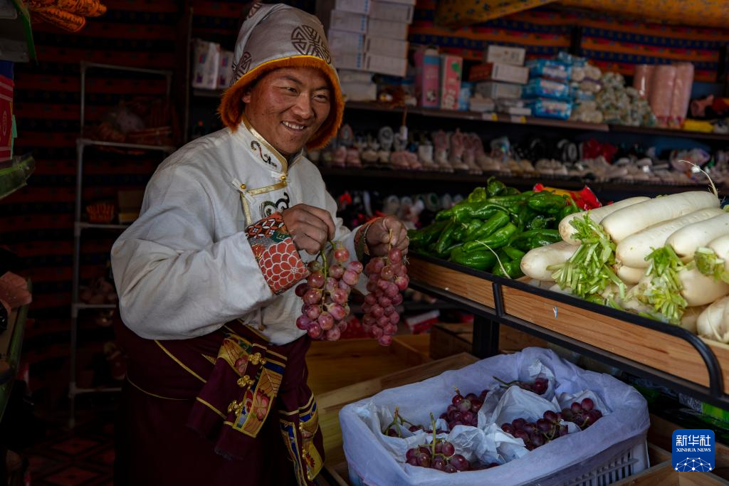 而今,他家门口的果蔬配送点常年供应数十种蔬菜和水果,世代吃肉饮茶的牧民们也逐渐日常摄入果蔬,膳食结构更加合理。“火龙果、猕猴桃、车厘子也能吃上,每顿饭都会配点蔬菜。”他说。