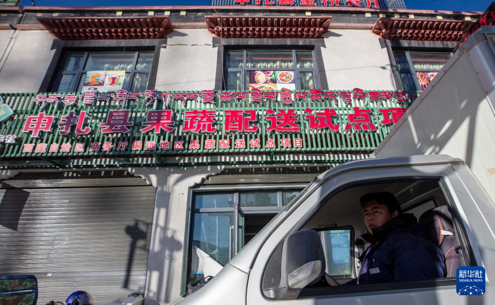 申扎县供销合作社的配送员巴拉从县城总店出发,为马跃乡贝嘎四村偏远乡镇果蔬配送试点项目直销点运送新鲜果蔬(1月5日摄)。新华社记者 姜帆 摄