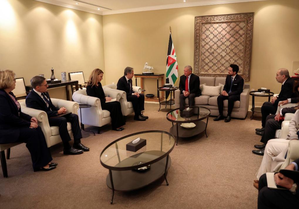 1月7日,约旦国王阿卜杜拉二世(中右)在安曼会见到访的美国国务卿布林肯(中左)。新华社发(约旦王宫供图)