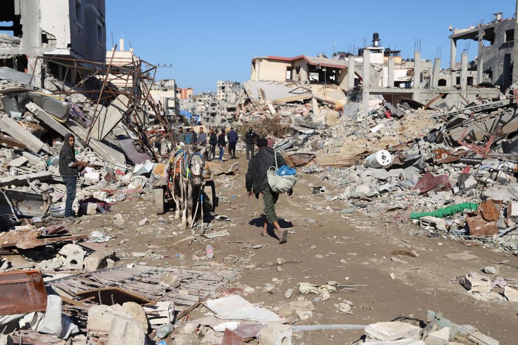 1月7日,人们走过加沙城的建筑废墟。新华社发(穆罕默德·阿里摄)