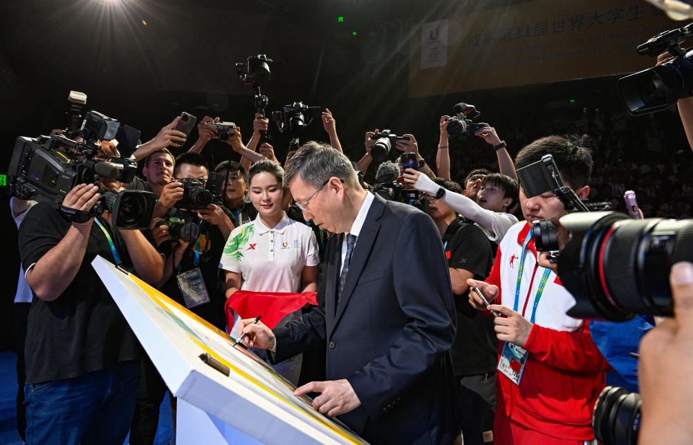 2023年7月22日,在成都大运会大运村开村仪式上,中国代表团团长王嘉毅签署大运卷轴。