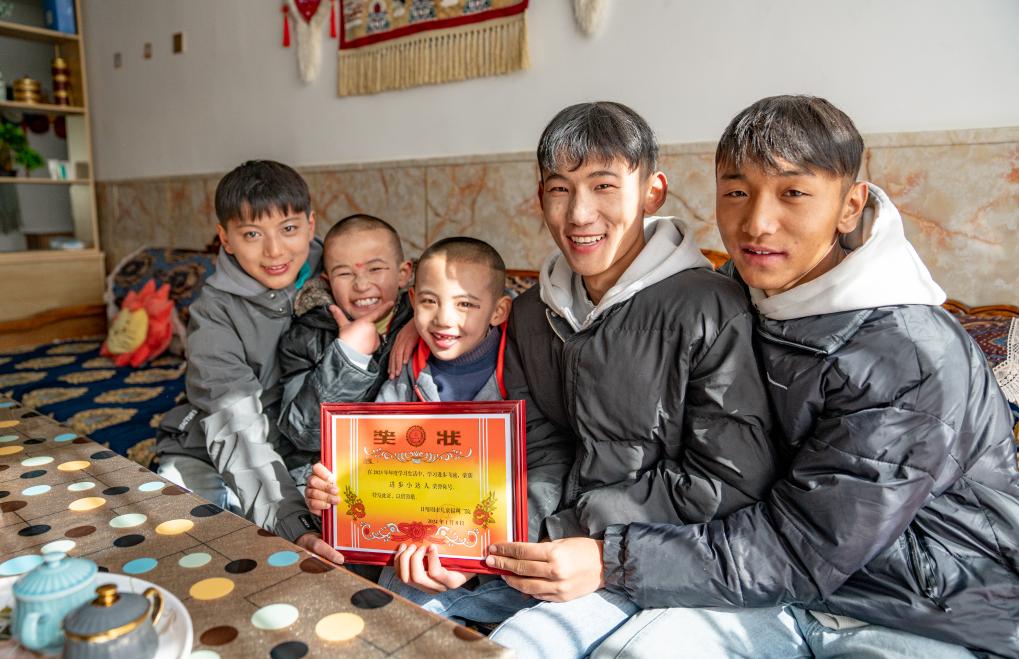 1月8日,“幸福家庭”的孩子们展示奖状。新华社发(丁增尼达摄)