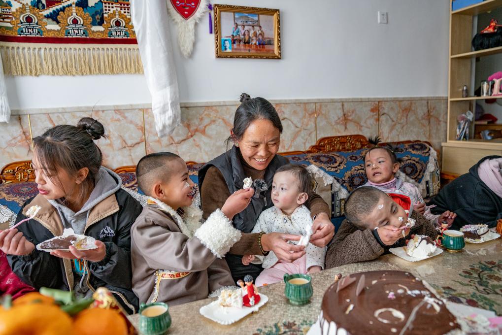 1月8日,巴桑和孩子们一起吃蛋糕。新华社发(丁增尼达摄)
