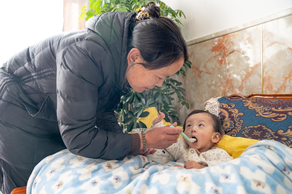 1月8日,巴桑在给一岁半的拉巴扎西喂饭。新华社发(丁增尼达摄)