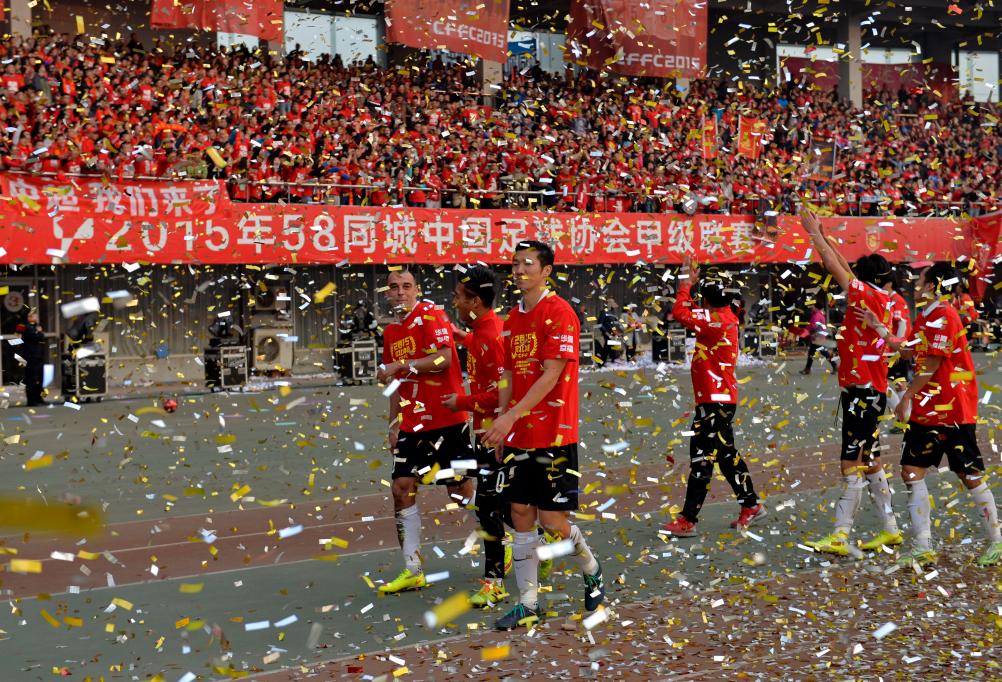 2015年11月1日,在秦皇岛举行的2015赛季中甲联赛最后一轮的比赛中,华夏幸福队主场以2:0战胜深圳宇恒队。新华社记者杨世尧摄