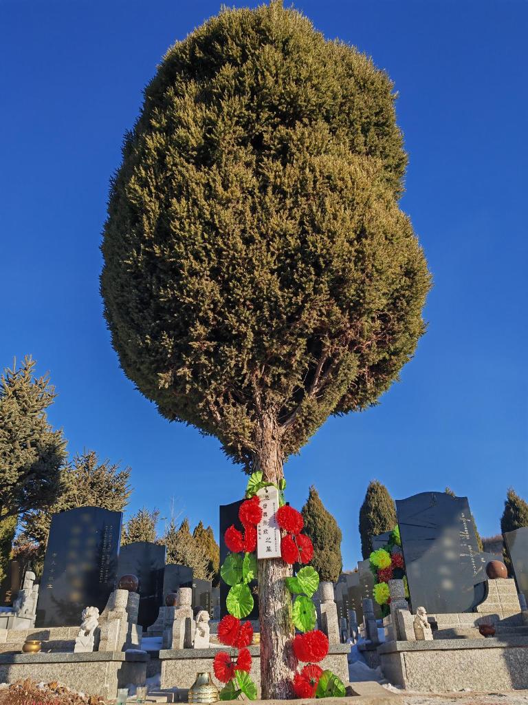 辽宁阜新市公墓的东南角,一棵挺拔翠绿的柏树树干上,挂有一个长30厘米、宽10厘米的小木牌,上写有“魏彤欣之墓”,一束花环环绕周围,在阳光的照耀下格外绚丽。
