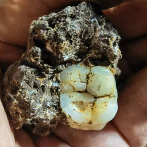 这是科研人员在广西发现的步氏巨猿牙齿化石(资料照片)。新华社发(王伟 摄)