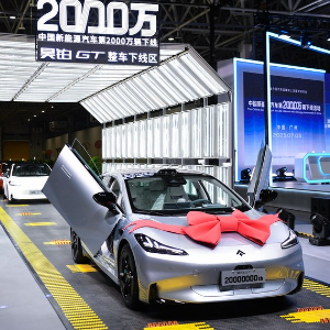2023年7月3日,中国新能源汽车第2000万辆下线活动在广州广汽埃安第一智造中心举行,这是作为中国第2000万辆下线的新能源汽车的昊铂GT。新华社记者 邓华 摄
