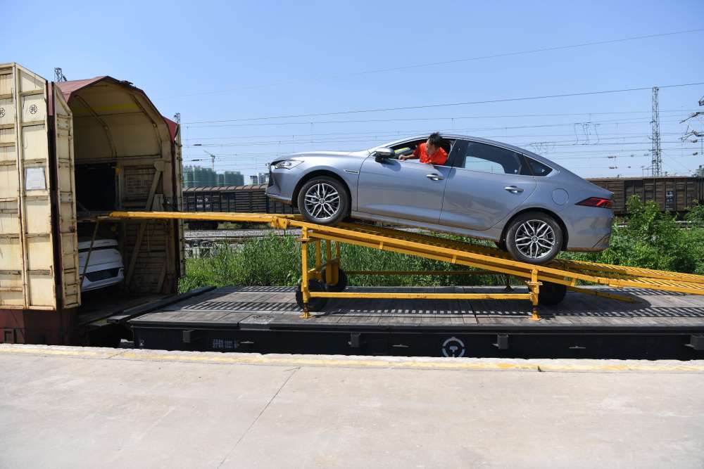 2023年5月9日,在中国铁路上海局集团有限公司淮南西站水家湖货运站,工作人员装运新能源汽车。新华社记者 刘军喜 摄