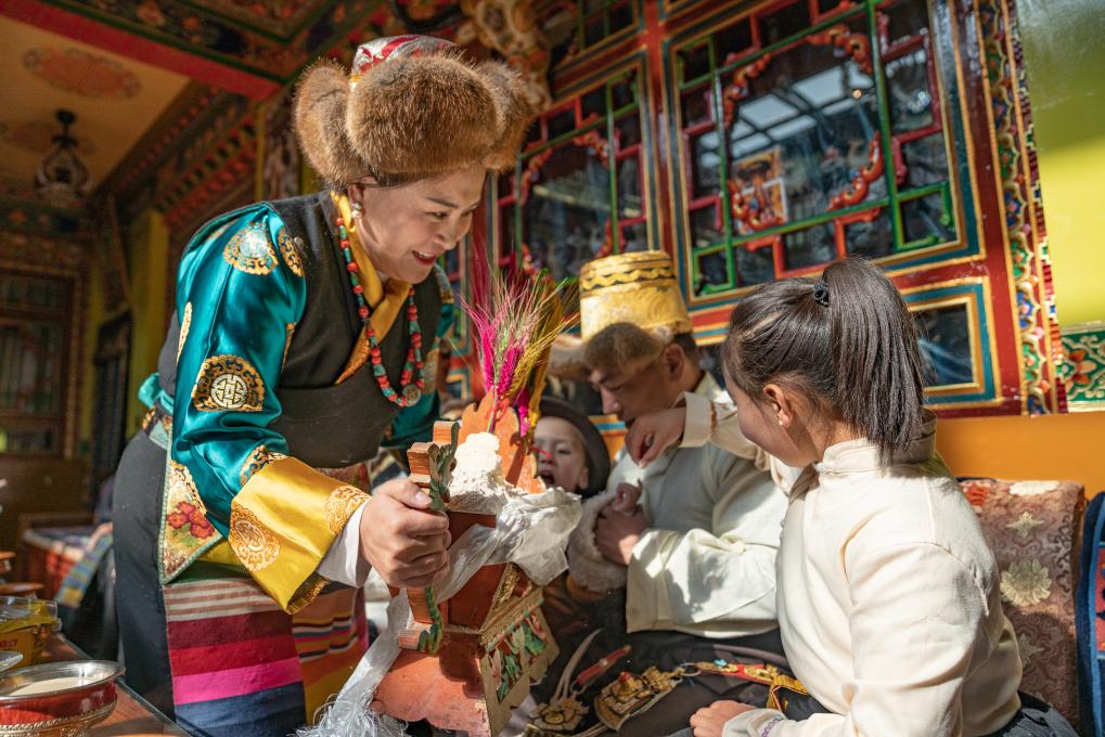 一家人按长幼次序落座,女儿次仁普尺逐一为大家献上切玛,这也是新年的重要仪式,寓意五谷丰登、六畜兴旺、家和万事兴。