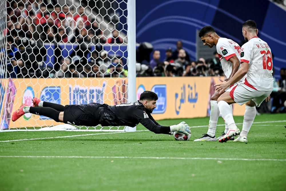 1月12日,男足亚洲杯揭幕战中,黎巴嫩队守门员穆斯塔法·马塔尔(左)在比赛中扑救。新华社记者 江汉 摄