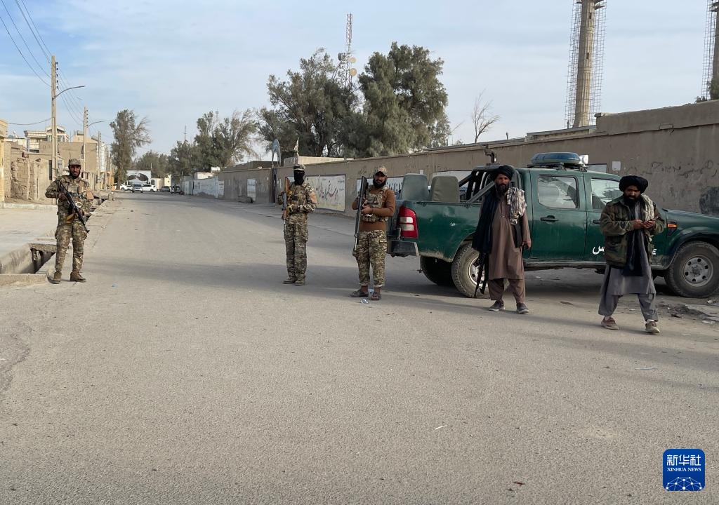 1月14日,安全人员在阿富汗尼姆鲁兹省的自杀式炸弹袭击现场附近执勤。新华社发(阿齐兹摄)