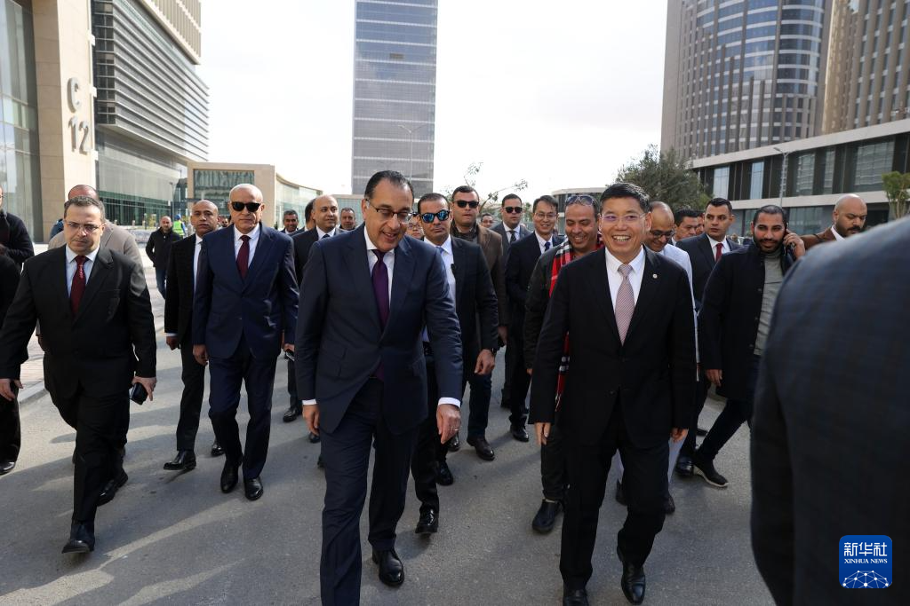 1月14日,埃及总理马德布利(前左)视察埃及新行政首都中央商务区项目。新华社发(黎炳宏摄)