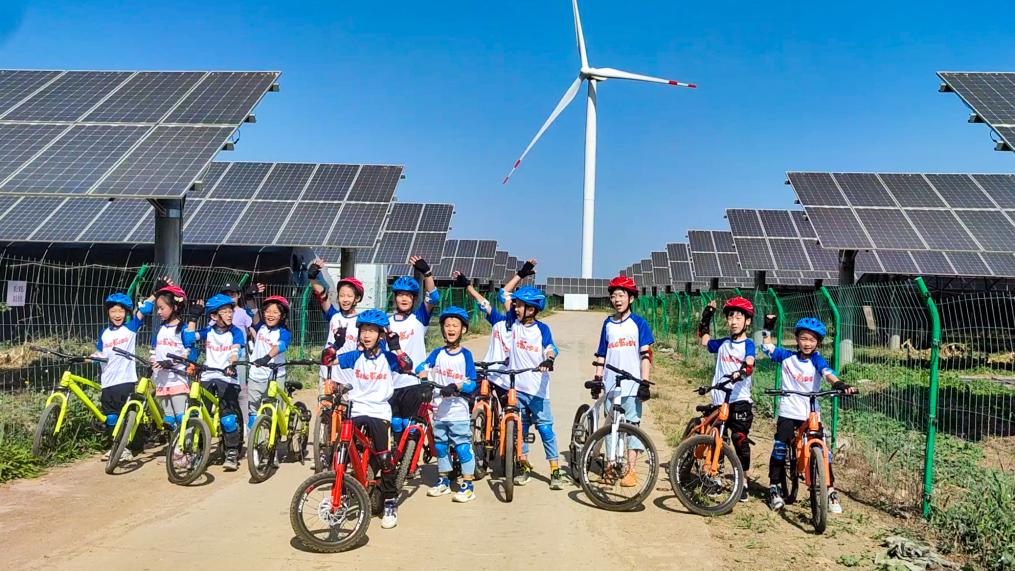图为研学团的小朋友们骑行参观小王庄镇光伏电站。新华社发(李畅摄)