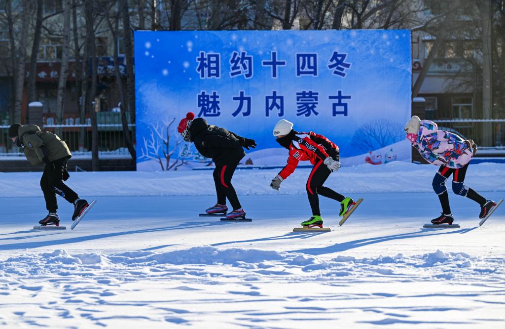 这个冬季,73岁的呼和浩特市民张凯也从轮滑“跨界”到了速滑。“冬天地面有冰霜,没法玩轮滑了,‘十四冬’启发了我们,可以换到冰场上去玩。”张凯说。