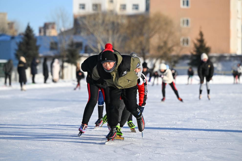 1月18日,呼伦贝尔市海拉尔区第七中学的学生们在校园里滑冰。新华社记者 刘磊 摄