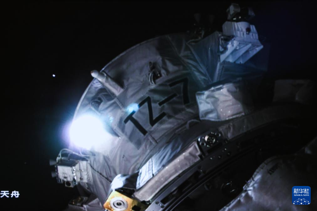 1月18日在北京航天飞行控制中心拍摄的天舟七号货运飞船向空间站组合体靠拢的画面。新华社发(韩启扬 摄)
