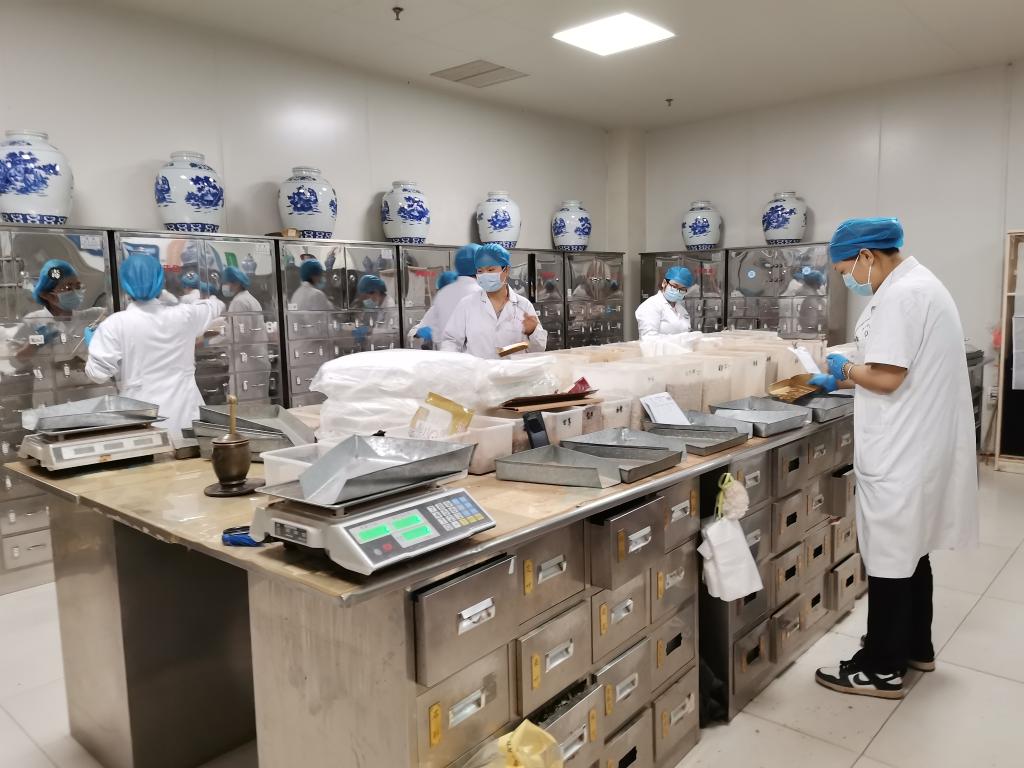 在山东省临沭县中医药医共体共享中药房,中药师在为患者调剂中药。新华社记者 田晓航 摄