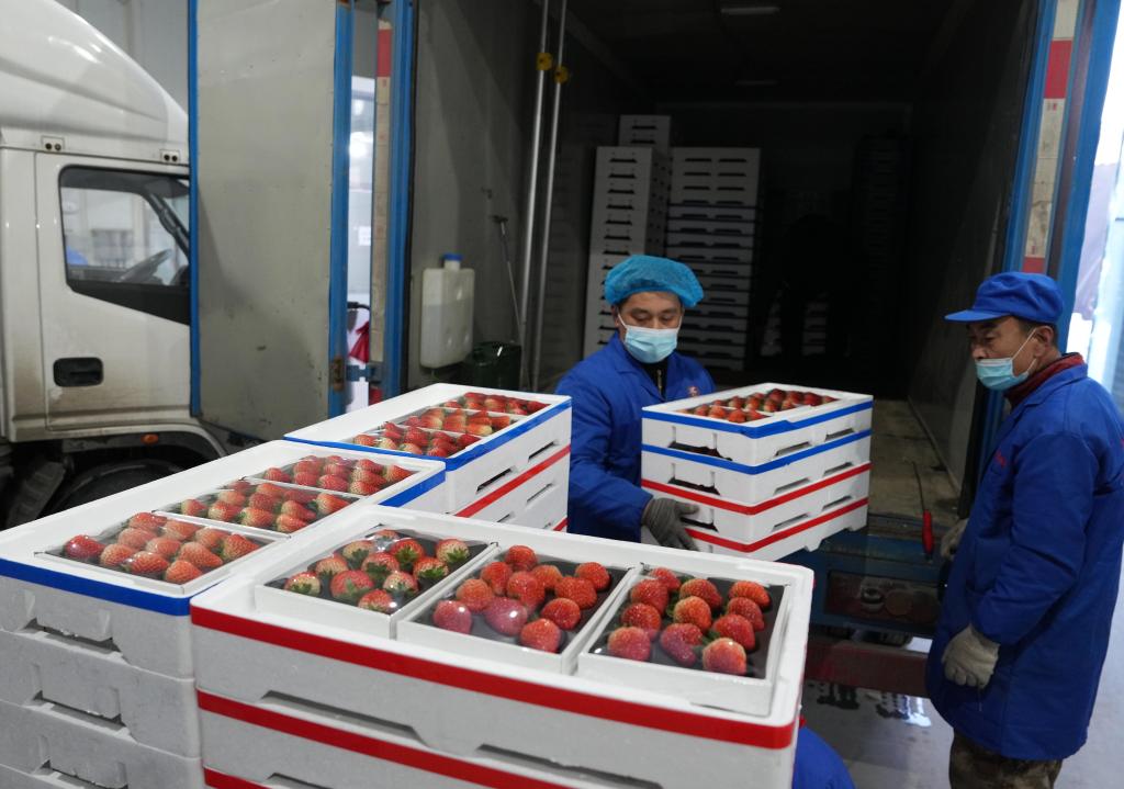 在东港的一处草莓包装车间,完成装箱的草莓将运往各地(1月9日摄)。新华社记者 李钢 摄