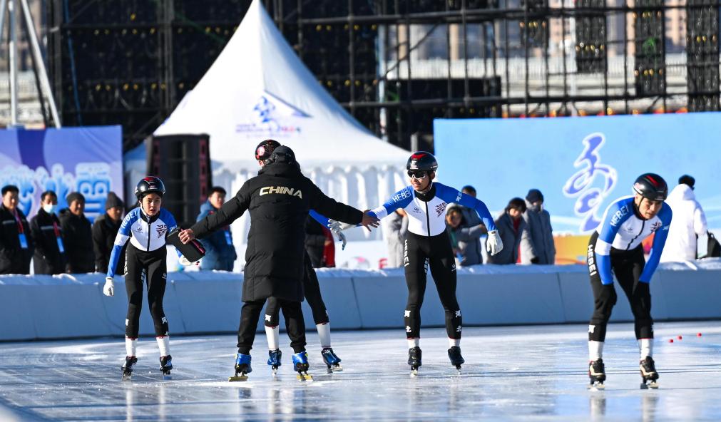 1月14日,在内蒙古呼和浩特市东河冰场举行的第十四届全国冬季运动会群众速度滑冰决赛中,河北队包揽4X200米混合接力、2000米混合团体两枚金牌。新华社记者 贝赫 摄
