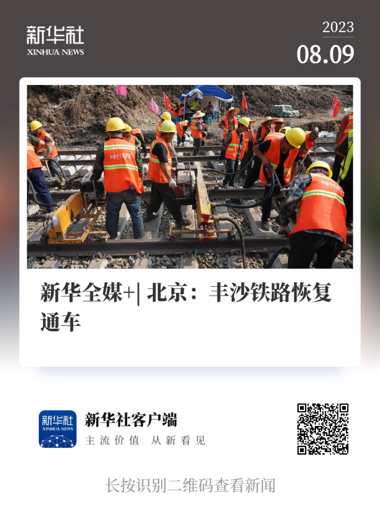 ↑2023年8月2日,救援人员背负救援物资沿着丰沙铁路线向安家庄村方向徒步。