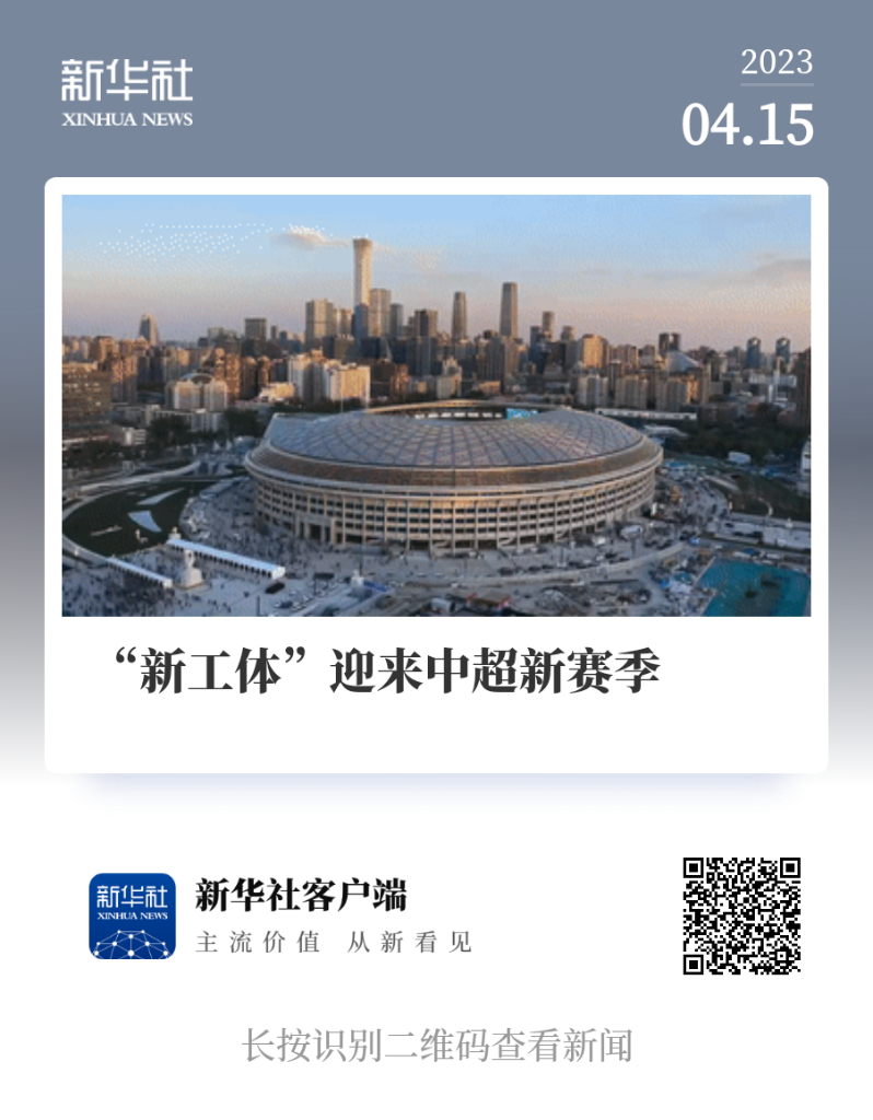 改造复建后的“新工体”迎接中超“新赛季”,拥有60多年历史的北京工人体育场,开启中国足球职业联赛的第30年、也是中超联赛诞生后的第20个赛季。2023年4月15日晚7点15分,新赛季中超联赛开幕式在新工人体育场举行,中国足球职业化的见证者、功勋教练金志扬与2022中国金球奖得主张玉宁共同推动划线车绘出新赛场,“共创新未来”字样的巨型横幅缓缓展开……经过两年多改造复建,这座承载众多荣耀的体育场在4万6千多名观众响彻云霄的欢呼声中、在屏幕前亿万球迷的注视下宣告回归。