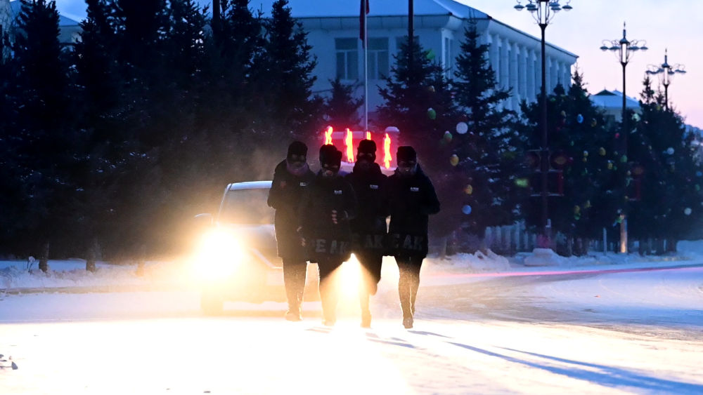 1月12日,中国冷极马拉松队队员在根河街头晨跑。新华社记者 张晟 摄