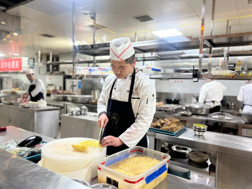 土豆宴厨师王红宇正在备菜。新华社记者 马晓洁 摄