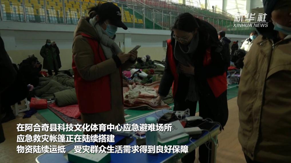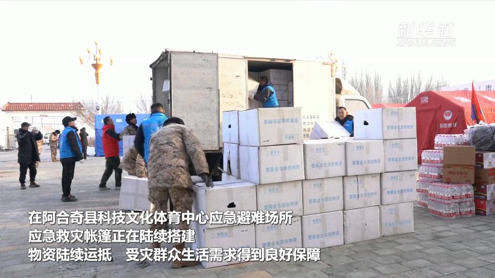 在阿合奇县科技文化体育中心应急避难场所,应急救灾帐篷正在陆续搭建,物资陆续运抵,受灾群众生活需求得到良好保障。