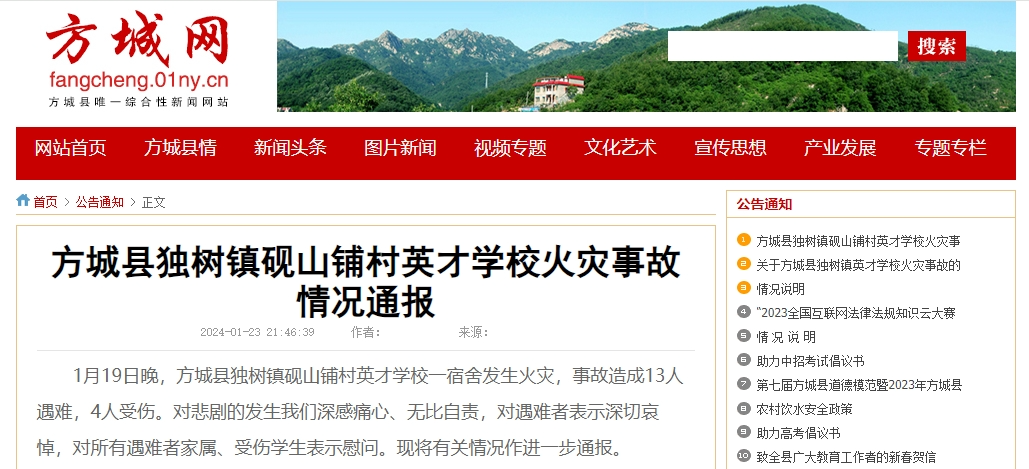 1月19日晚,方城县独树镇砚山铺村英才学校一宿舍发生火灾,事故造成13人遇难,4人受伤。对悲剧的发生我们深感痛心、无比自责,对遇难者表示深切哀悼,对所有遇难者家属、受伤学生表示慰问。现将有关情况作进一步通报。