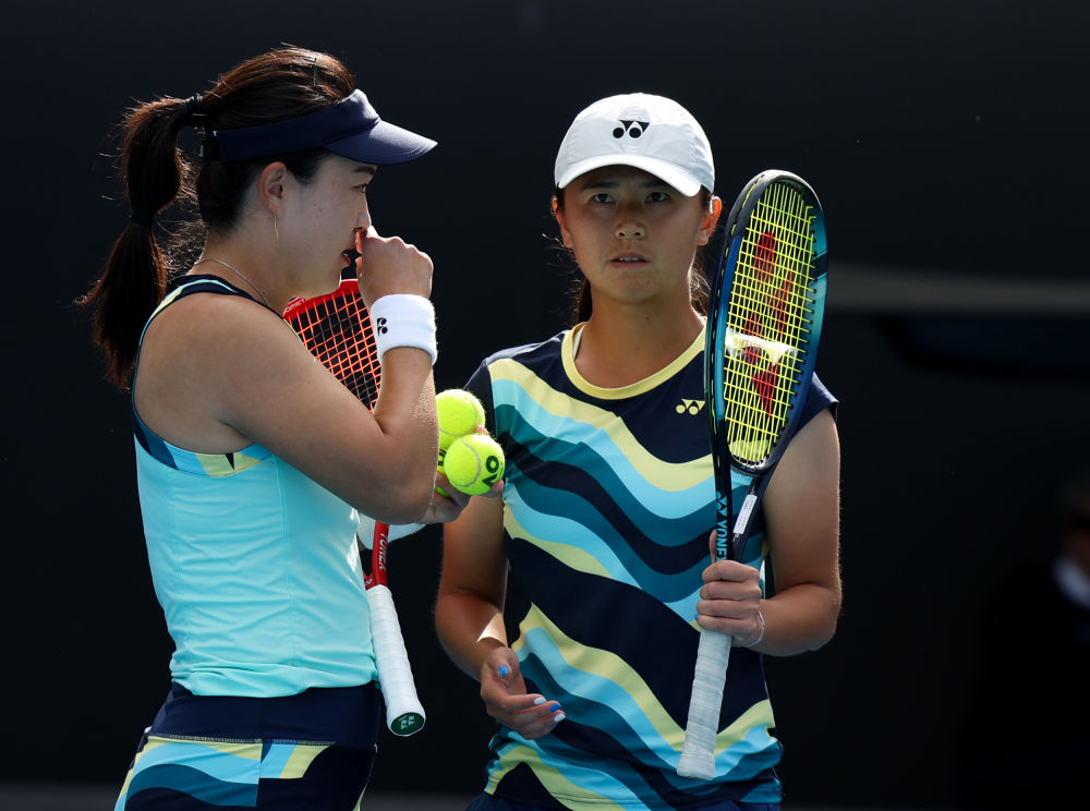 1月22日,朱琳(左)/吴芳娴在比赛中交流。新华社记者 马平 摄