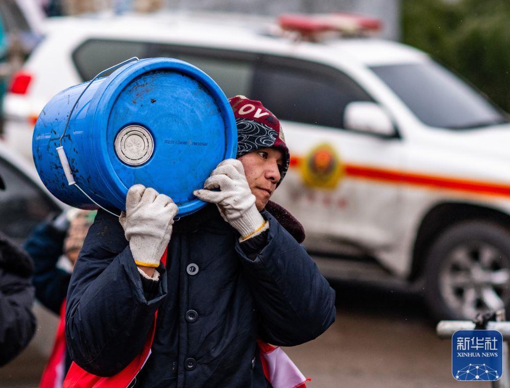 1月24日,自愿报名参加志愿服务的凉水村村民王再云往现场搬运物资。新华社记者 江文耀 摄