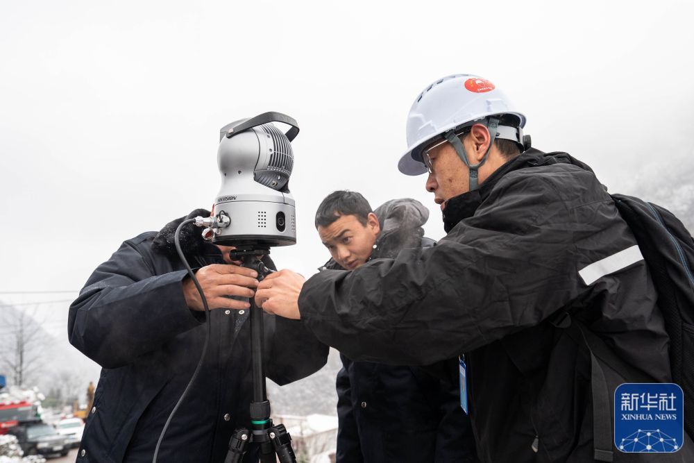 1月24日,中国移动工作人员陈晗(右)在镇雄县塘房镇凉水村安装救援设备。新华社记者 胡超 摄