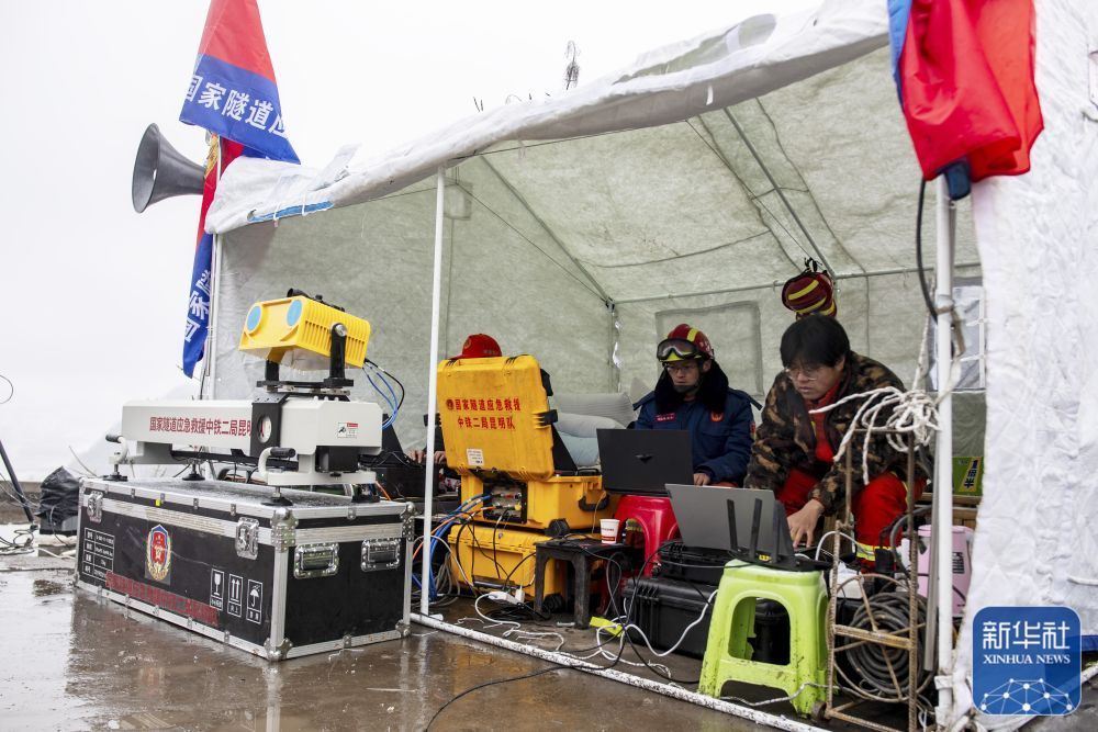 1月24日,国家隧道应急救援中铁二局昆明队中队长熊丹(中)在救援现场的便携式边坡雷达与轨道式边坡雷达阵地工作。新华社记者 江文耀 摄