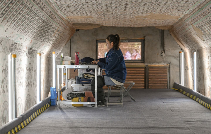 2023年8月3日,在敦煌莫高窟正在保护修缮的第55窟内,一位文保工作者对采集的数据进行整理。新华每日电讯记者 李贺 摄