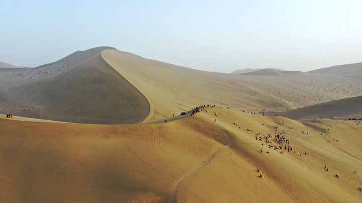 2023年9月11日,游客在甘肃省敦煌市鸣沙山月牙泉景区游览。新华社发(张晓亮 摄)