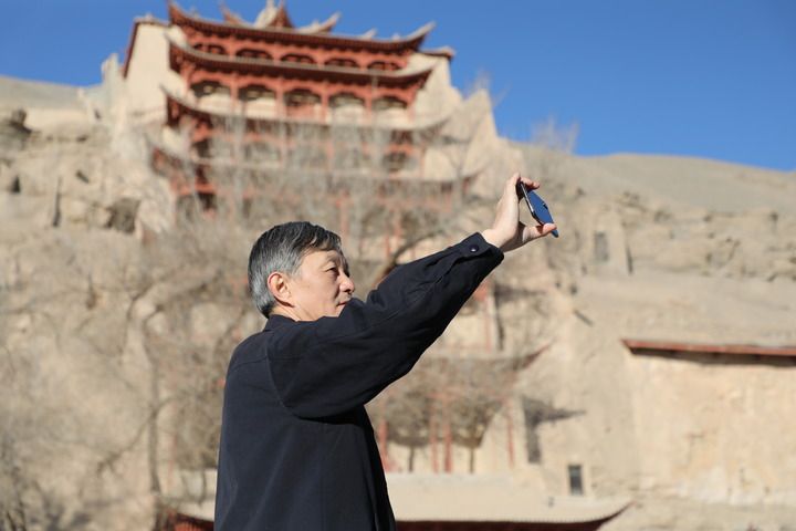 2022年2月23日,敦煌研究院院长苏伯民正在用手机进行“数字敦煌”体验。 新华每日电讯记者 张睿 摄