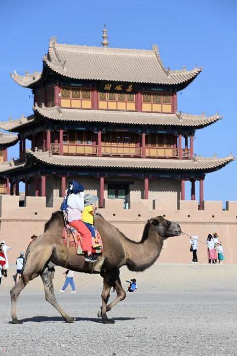 2023年8月7日,游客在嘉峪关关城外骑骆驼。 新华每日电讯记者 范培珅 摄