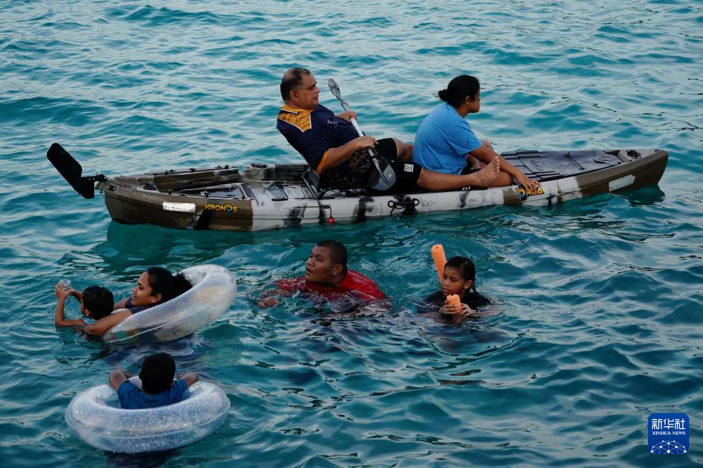 1月20日,瑙鲁人在水中休闲娱乐。新华社记者 王申 摄