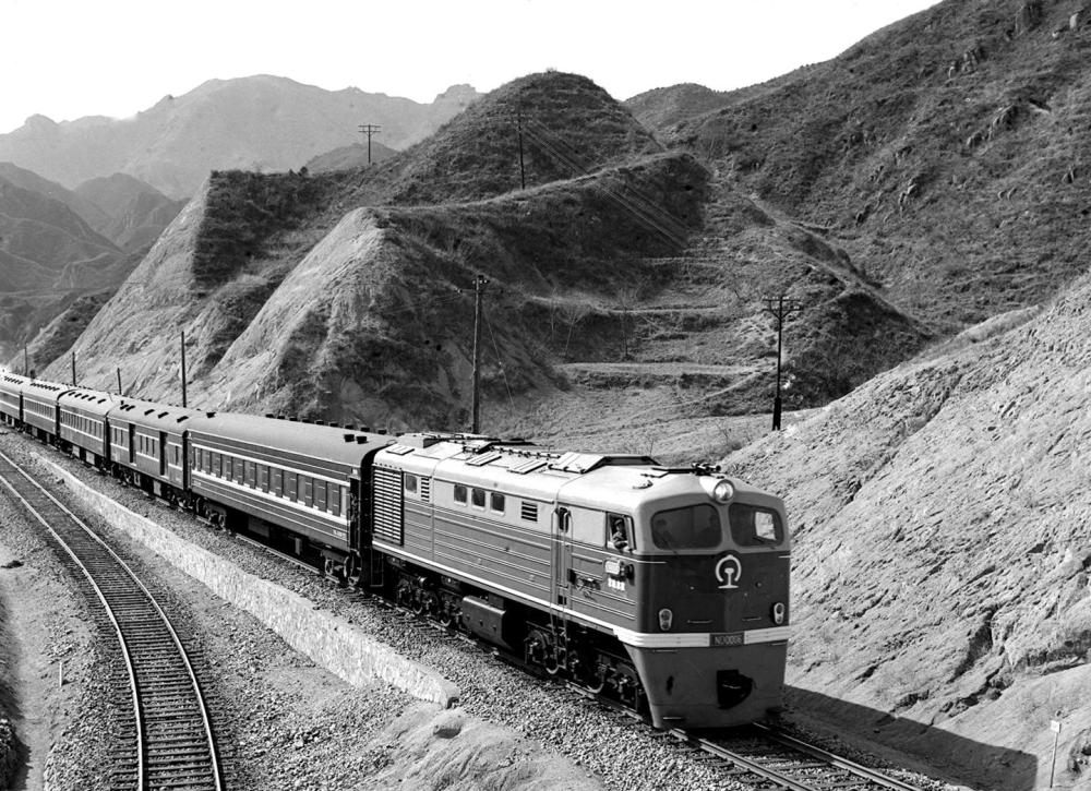 ↑1965年,大连机车车辆工厂生产的2000马力电传动内燃机车,牵引着旅客列车行驶在京包线上。新华社记者喻惠如摄