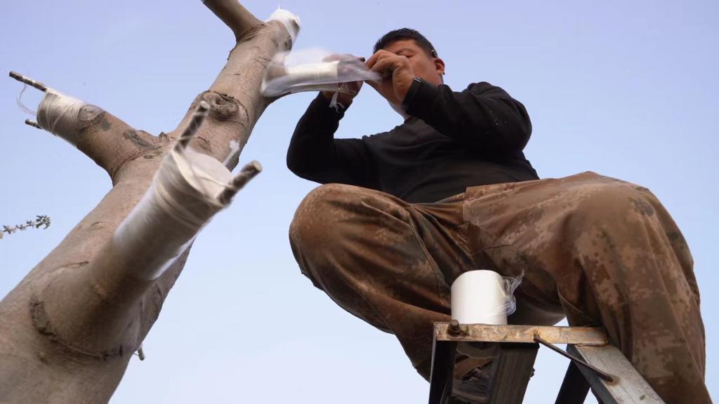 冯元明在嫁接果树(资料图片)。新华社发(高本增摄)