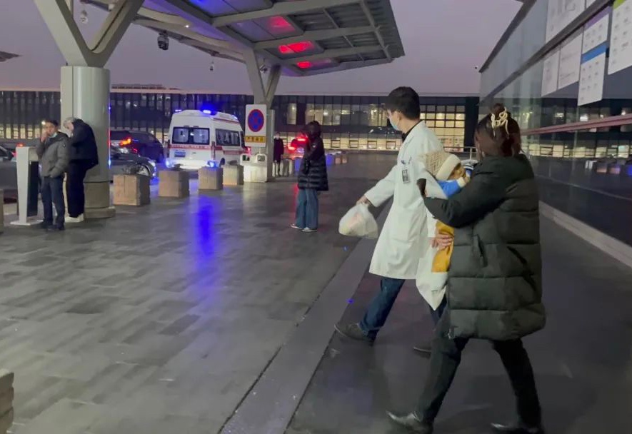 1月18日晚,浙大二院医生接上德勒和他的妈妈,救护车也等候在机场外。新华社发(金宇婷摄)