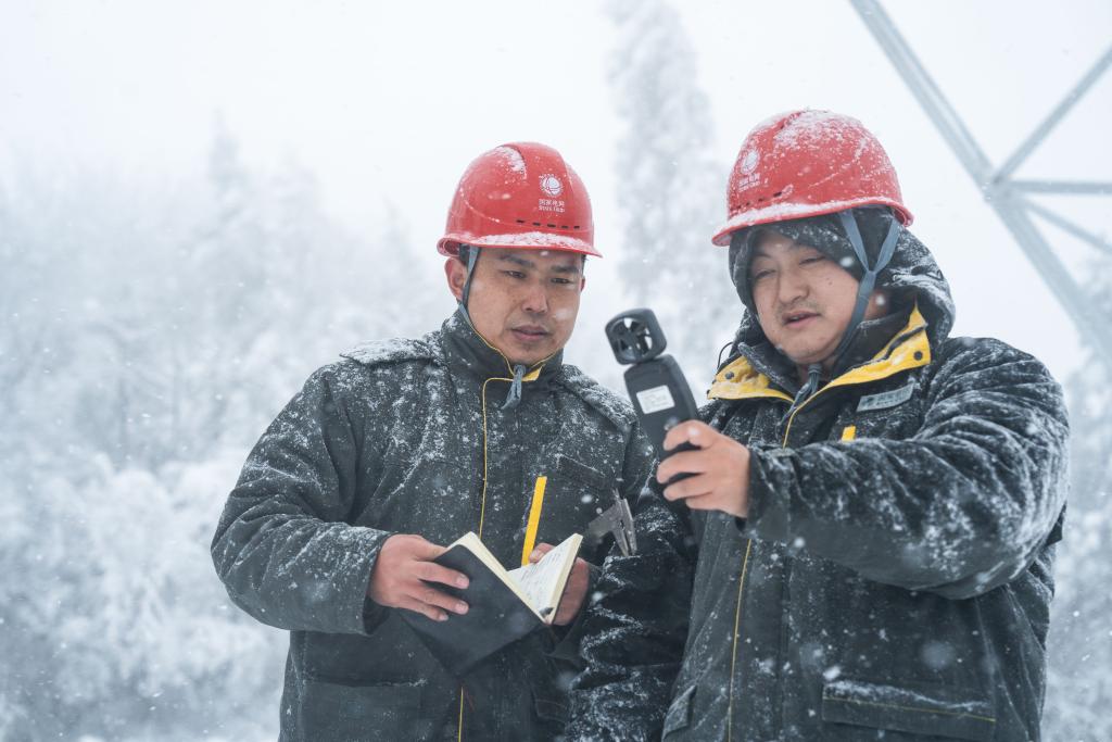 1月22日,在湖南省浏阳市蕉溪镇蕉溪岭,国网长沙供电公司输电检修人员在巡线途中监测电力设施覆冰情况。 新华社记者 陈思汗 摄